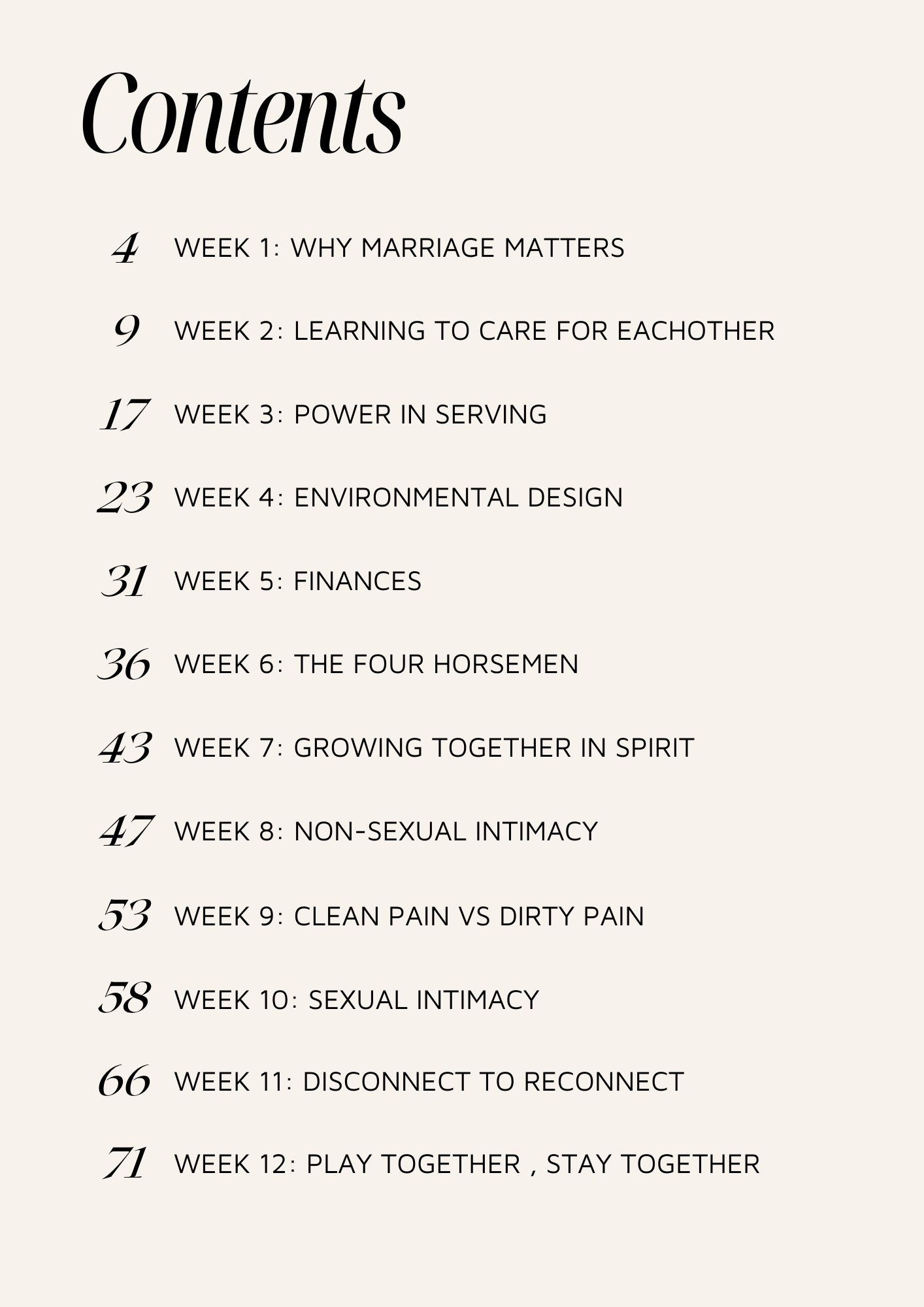 Across 76 thoughtfully designed pages, couples are invited into meaningful conversations through engaging readings, guided exercises, and reflection questions. Each week builds on the last, helping you move from simply sharing space to truly nurturing your relationship.